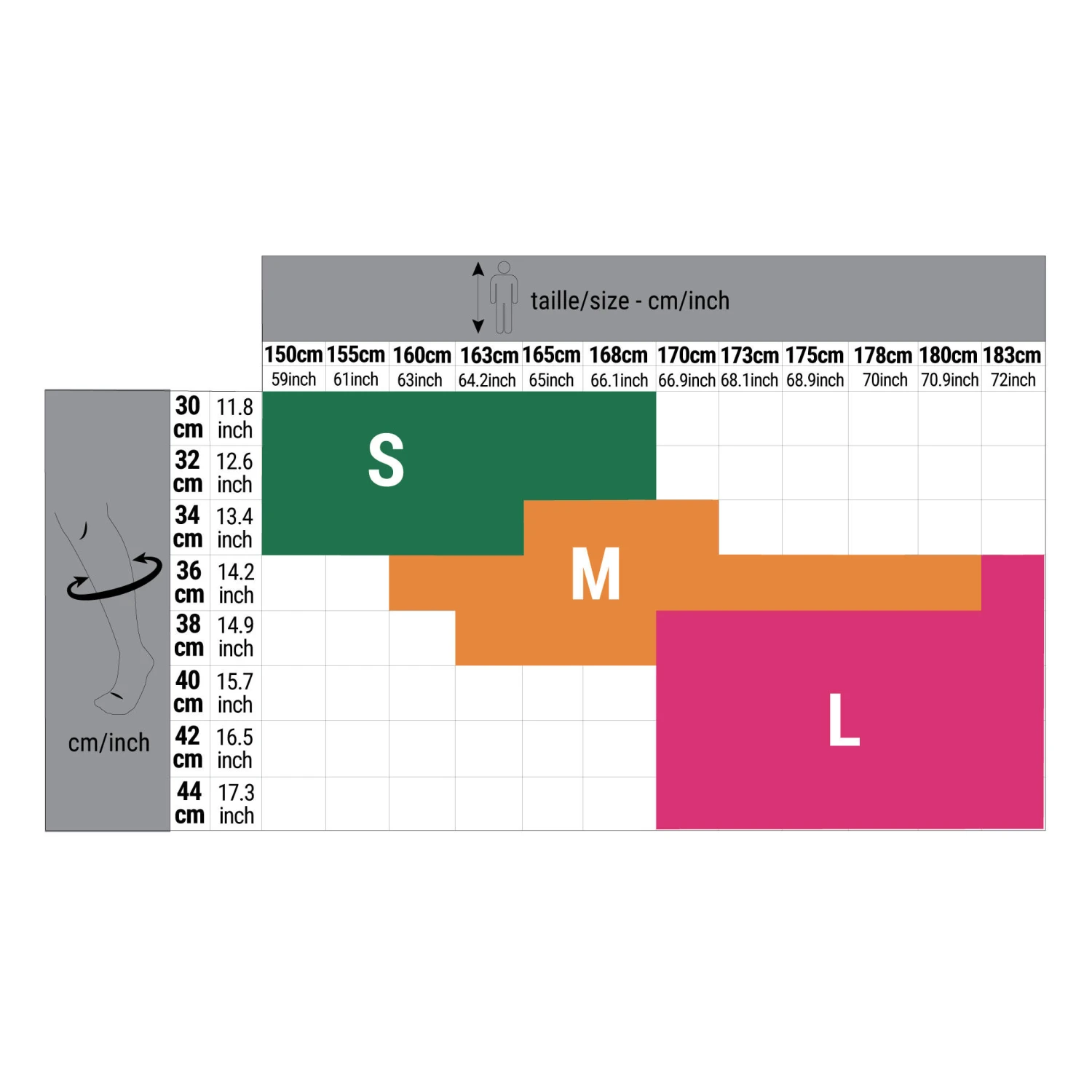 In order to choose the most suitable size for your leg, take a tape measure and measure your calf at the widest point. Then refer to the size choice guide table (show on the product label or in the images above on this page).