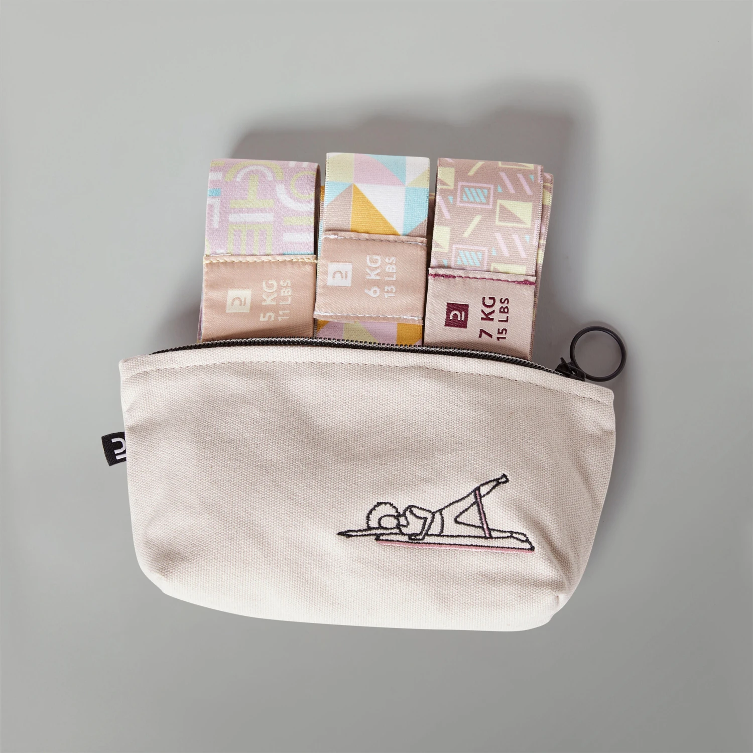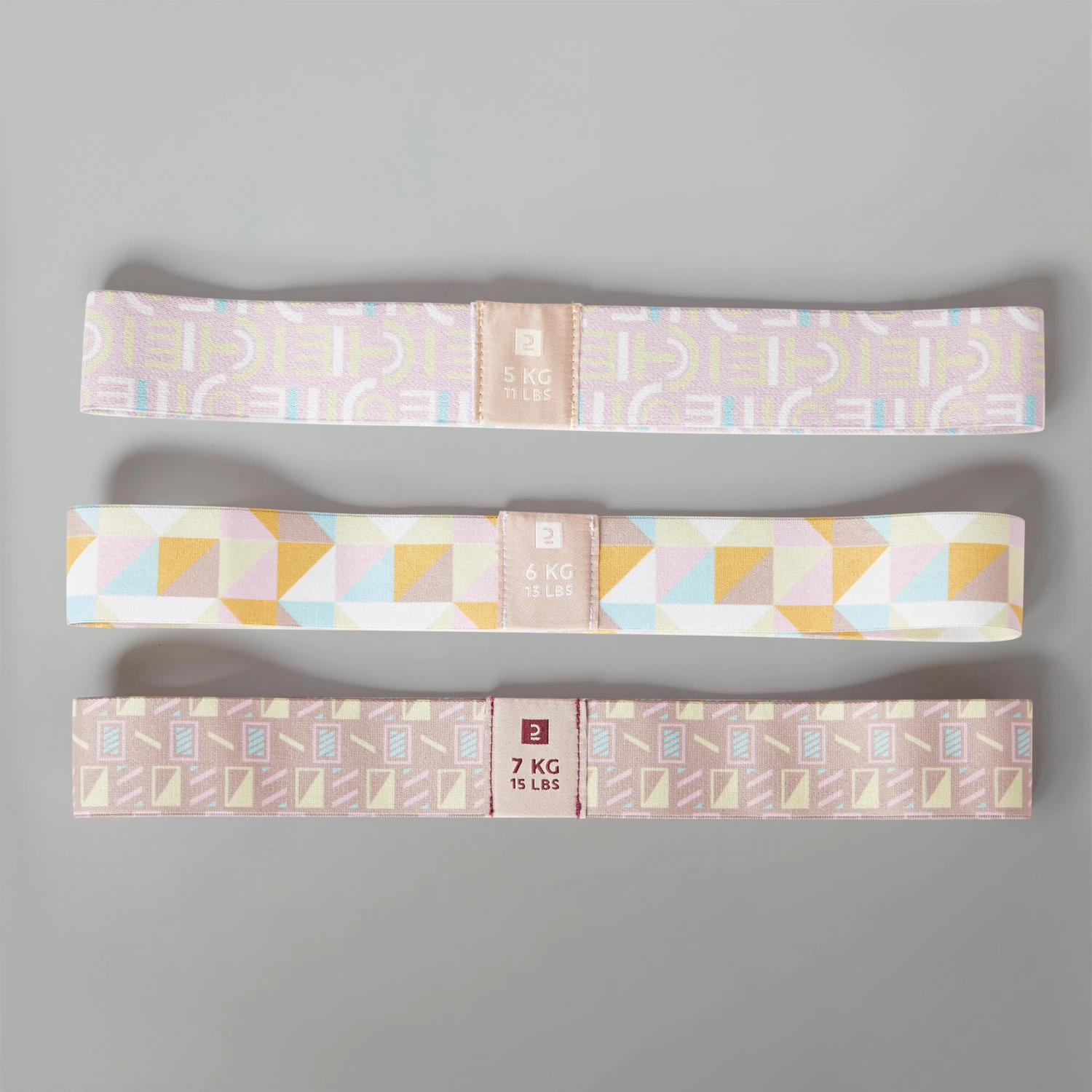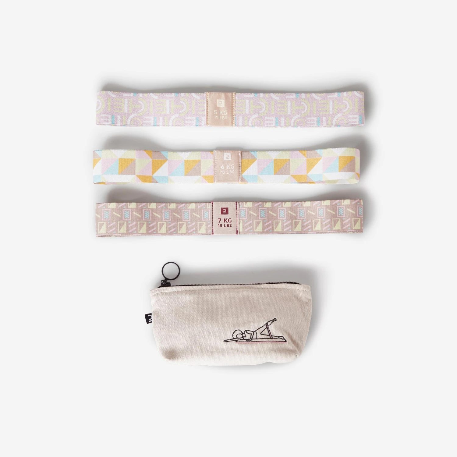 This set of mini resistance bands, eco-designed with 56% undyed components, is perfect for strength training targeting your glutes and thighs with three resistance levels (5-6-7 kg).Take these versatile and compact bands anywhere in their built-in pouch!