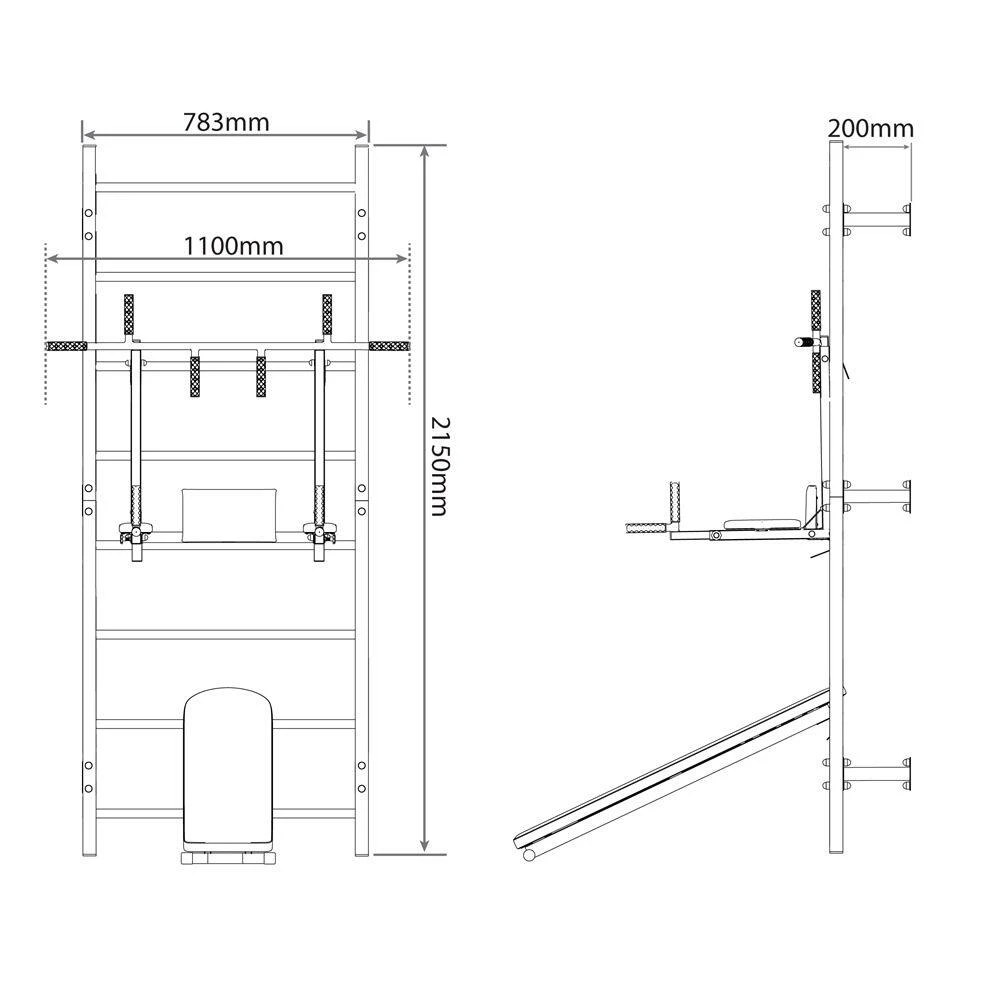 The core of this training set product is a Swedish ladder, ideal for endurance and strength exercises. The set is completed by a pull-up bar with dip station and a sit up bench.